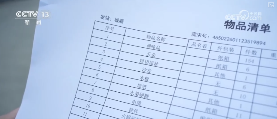 经过一夜忙碌,上午九点多,满载着26个集装箱、100多种货品的X8658次货运班列从站台出发奔向大湾区。这一叠是这趟班列的物品清单,仅一个集装箱里就有五金、电缆、铁件等大件,还有火锅底料和新鲜蔬菜。