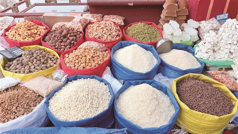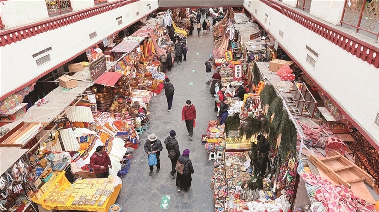 顿珠则在摊位前挑选了一款极具当地特色的门帘。“冬天天气冷,又赶上藏历新年快到了,挂上门帘既能挡风保暖,又能增添节日氛围。” 顿珠说,八廓商城的一站式采购太方便了,吃的、喝的、穿的、用的一应俱全,不用东奔西跑,省了不少时间和精力。