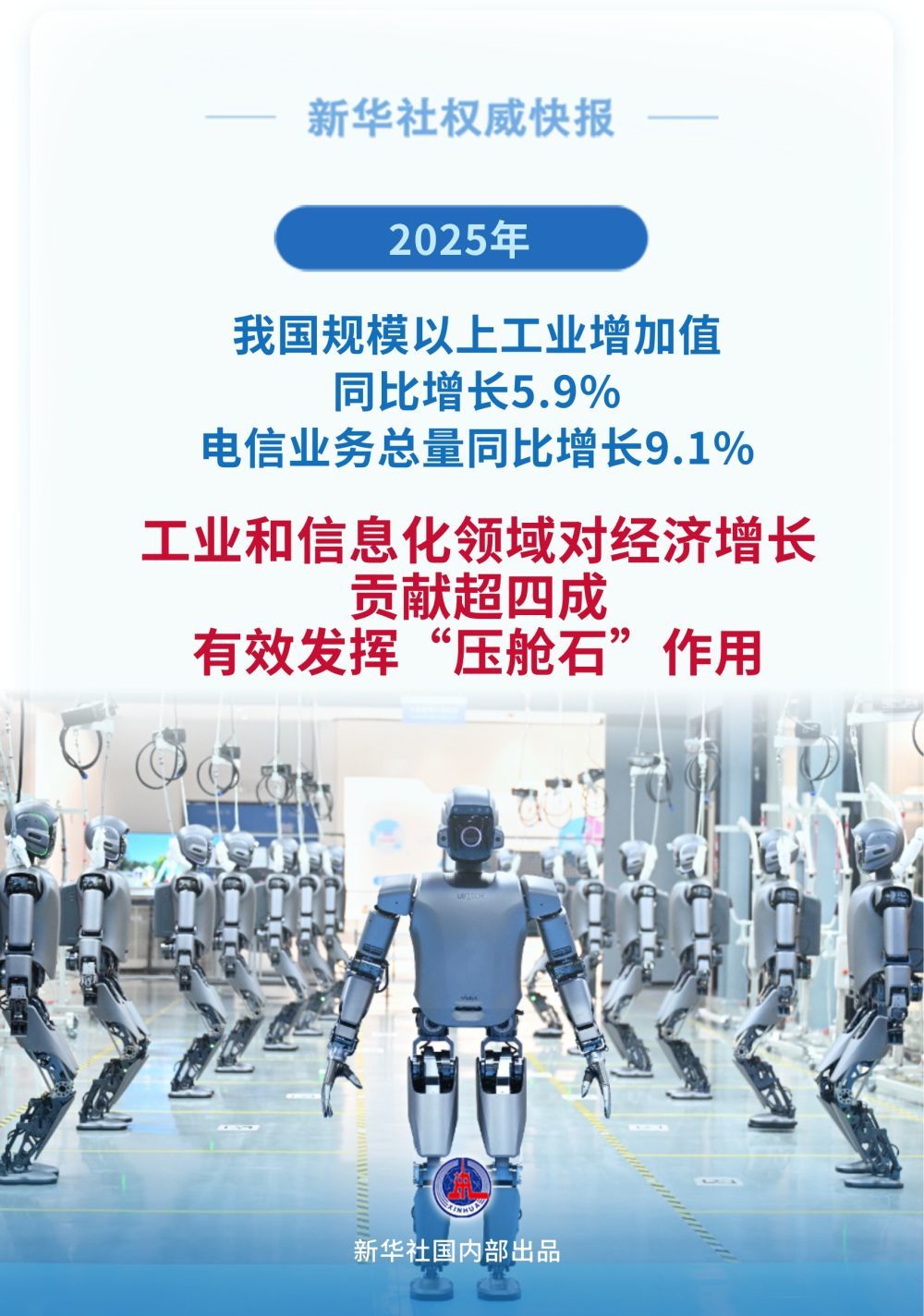 工业和信息化部副部长张云明1月21日在国新办举行的新闻发布会上说,2025年,我国规模以上工业增加值同比增长5.9%,制造业增加值占GDP比重保持稳定,电信业务总量同比增长9.1%。工业和信息化领域对经济增长的贡献超四成,有效发挥“压舱石”作用。