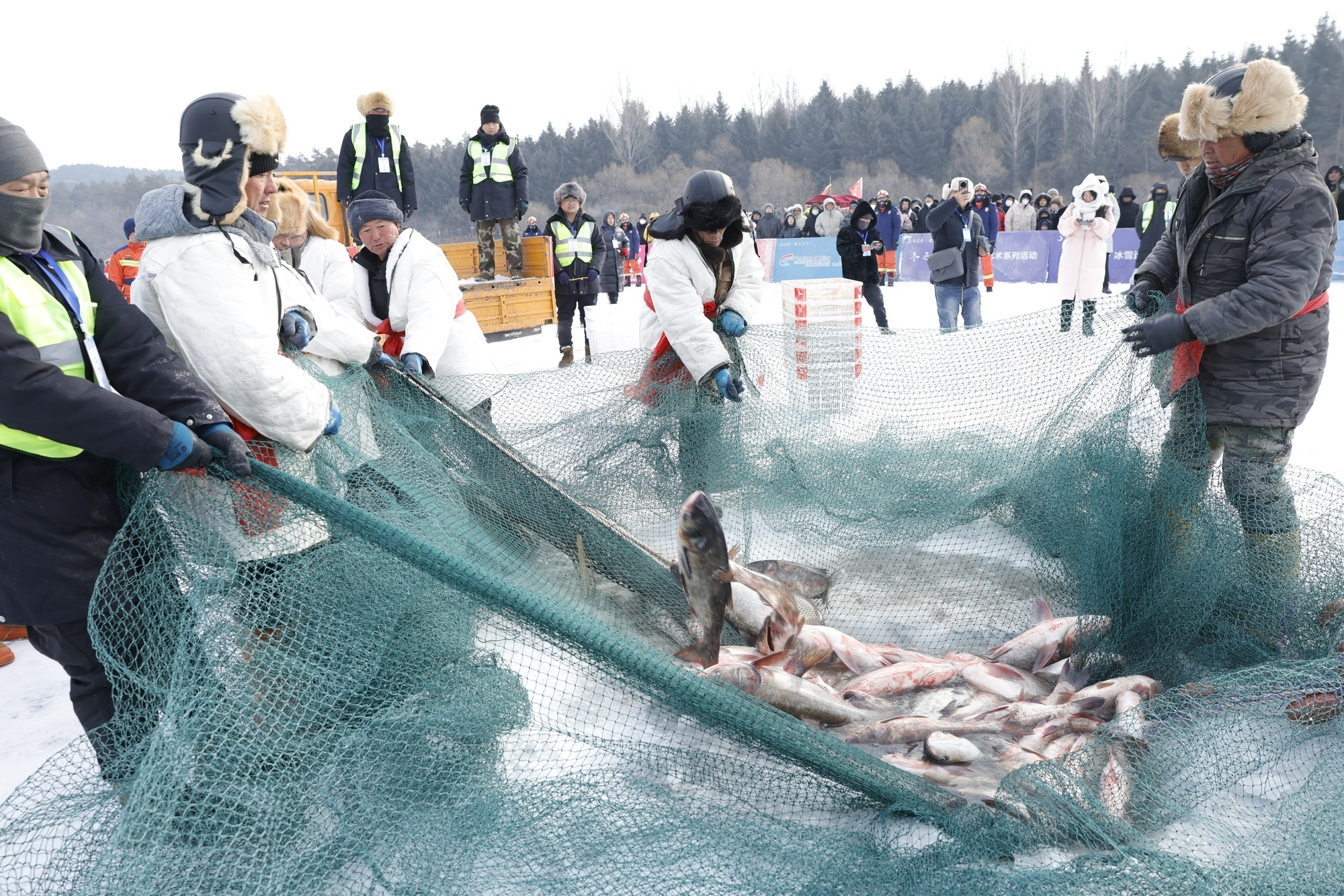伴随着“鱼把头”一声令下,数万条活鱼跃出水面,“冰湖腾鱼”的盛景瞬间点燃寒冬。
