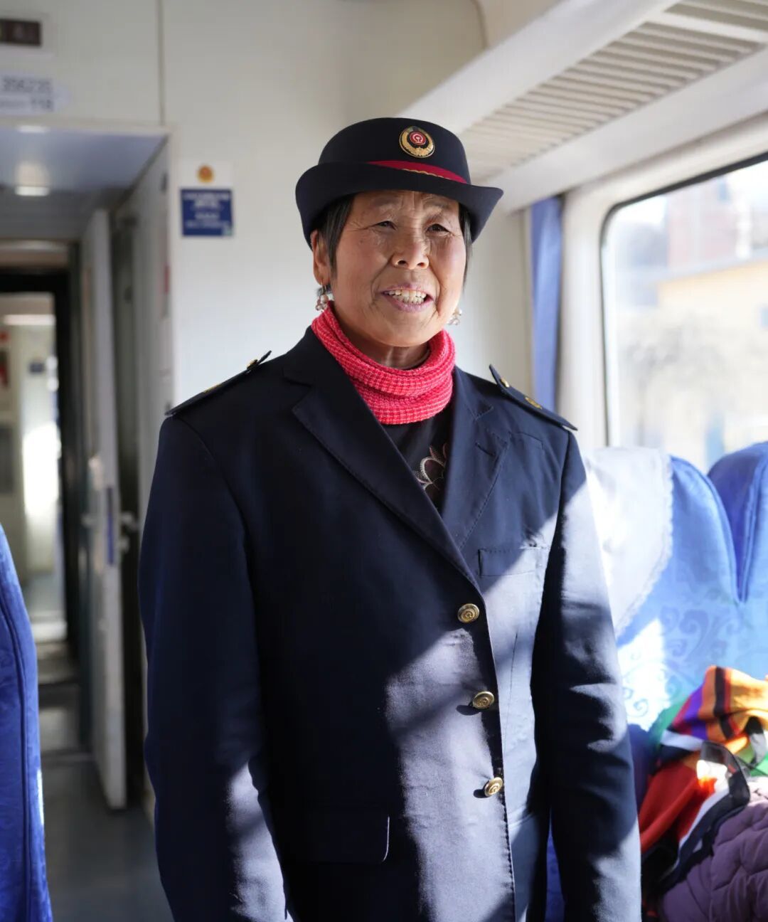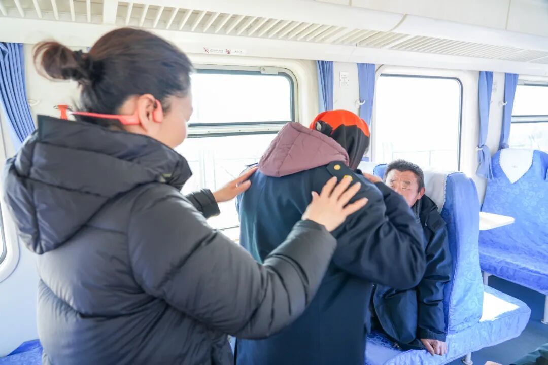 照完相,郭大娘久久不舍得脱下这身衣服,摸摸扣子,拉拉衣角,眼里漾着光。半个多世纪的光阴里,这趟车叮叮当当穿过山川,也穿过了她的一生。如今,这个朴实而遥远的心愿,就在这个冬日,被一群亲切的铁路人轻轻点亮。