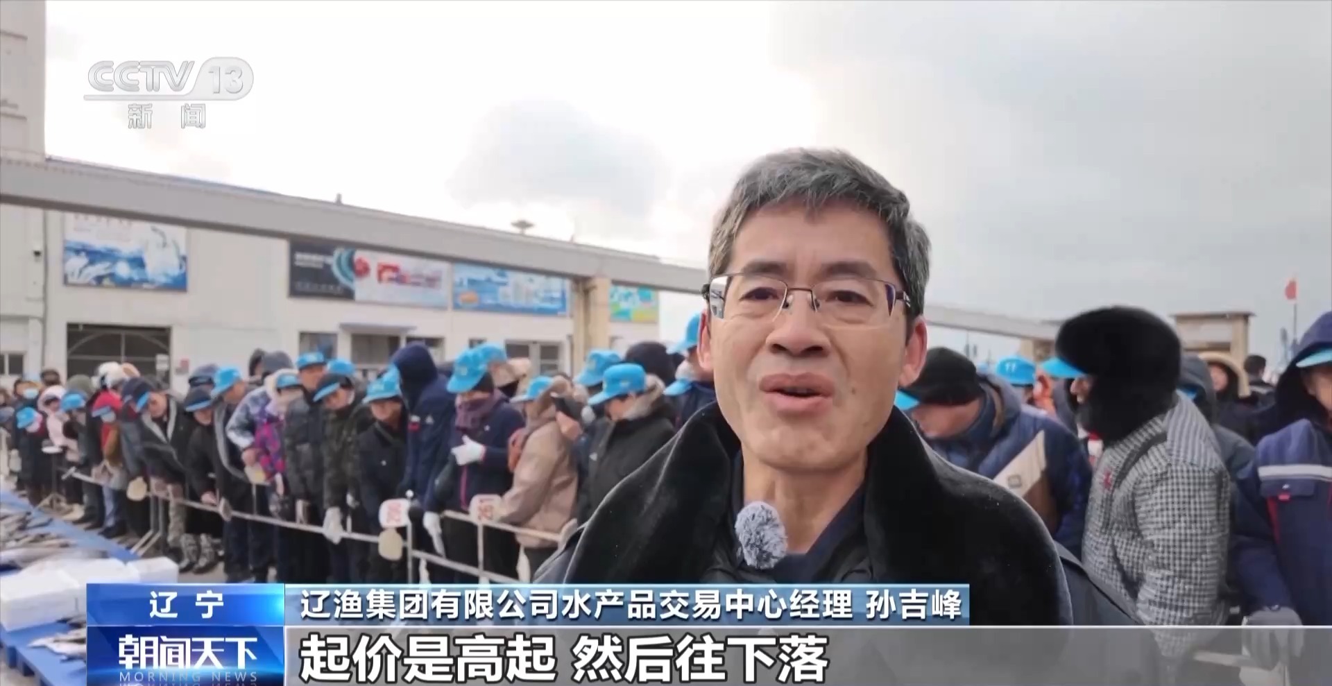 辽渔集团有限公司水产品交易中心经理 孙吉峰:起价是高起,然后往下落,等到会员有需要时他就举牌了。举牌的时候就开始往上竞价,竞价是价高者得,上不封顶。