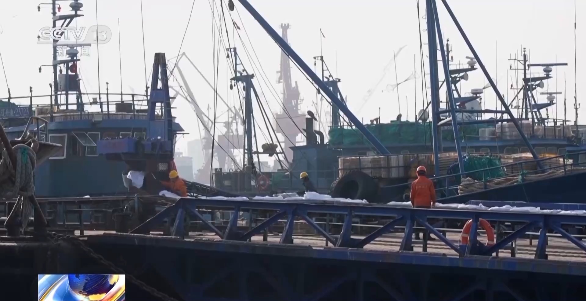 在辽渔国际水产品交易中心码头,刚刚返回码头的几艘捕鱼船只正在利用自动化设备,卸载一箱箱捕捞上来的海产品。