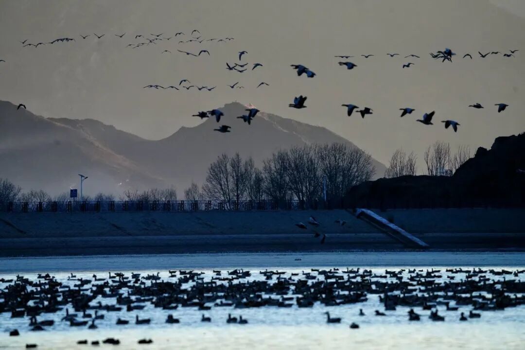 布达拉宫巍然耸立与结冰的水面构成一幅静谧的冬日画卷。这里是候鸟越冬的天堂,黑颈鹤、斑头雁等候鸟在此栖息,为湿地增添了无限生机。