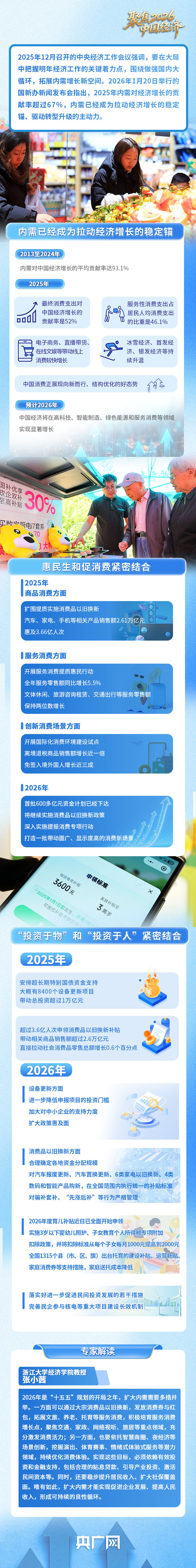 国新办最新发布的数据显示,2025年,内需对经济增长的贡献率超过67%,其中消费贡献率达到52%。新需求引领新供给,新供给创造新需求,已经形成了良性互动。同时,国内供强需弱的矛盾比较突出,中国经济如何向“内”求变?2026年扩大内需工作应从哪些方面着手,最终惠及民生?央广网邀请相关专家进行解读。