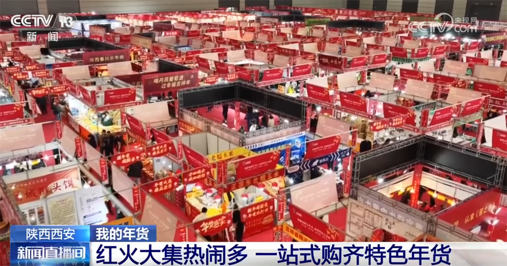 欢迎大家跟随我们的镜头来到西安市浐灞区的年货集市现场。大家看,集市已经完全被喜庆的红色和热闹的人群包围了。这里展出面积约1.6万平方米,每天都有超过1.5万人来这里购买年货。今年的年货节主打全面和实惠,从地道的腊牛羊肉、糕点干果到充满巧思的“马”年文创、非遗手作、年画对联,可以说是“一站式”购齐陕西年味。接下来去看看,西安的街坊邻里、八方来客都在这里买了什么年货。