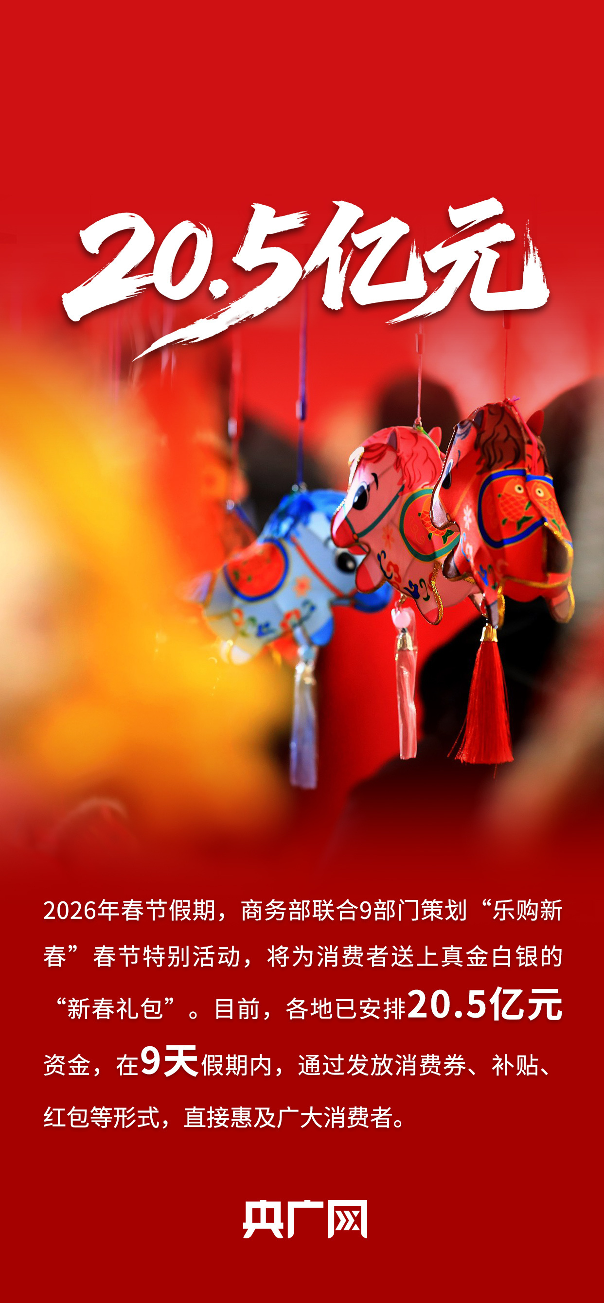 2月11日上午10时,国务院新闻办公室举行新闻发布会,相关负责人介绍2026“乐购新春”春节特别活动、保障春节市场供应有关情况,并答记者问。会上介绍,超20亿元“新春礼包”即将派送,春节9天假期有奖发票的奖金规模将超过10个亿……戳图!一组关键词读懂“乐购新春”。