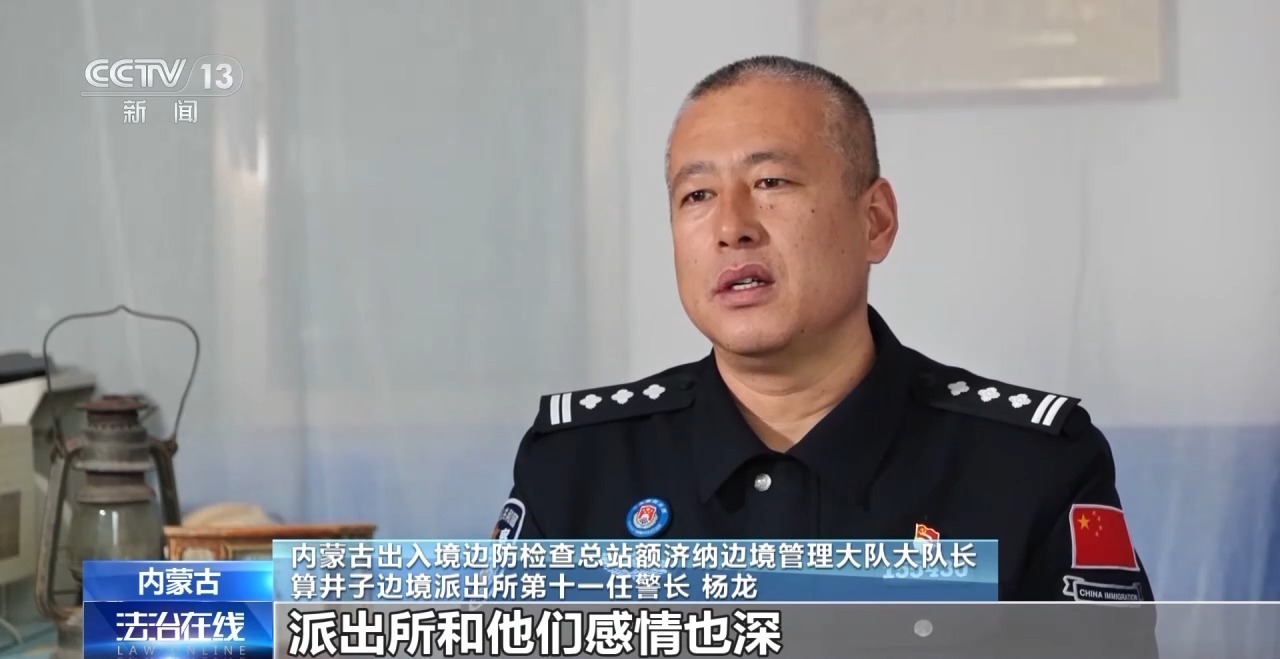 内蒙古出入境边防检查总站额济纳边境管理大队大队长 算井子边境派出所第十一任警长 杨龙:我来的时候接受的教育就是爱民护边,跟牧民的关系就是老一辈那就传承下来的。像后面我们一个老额吉,我调出去也是一样,我也会回去看她,派出所和他们感情也深,他们跟派出所的感情也深。
