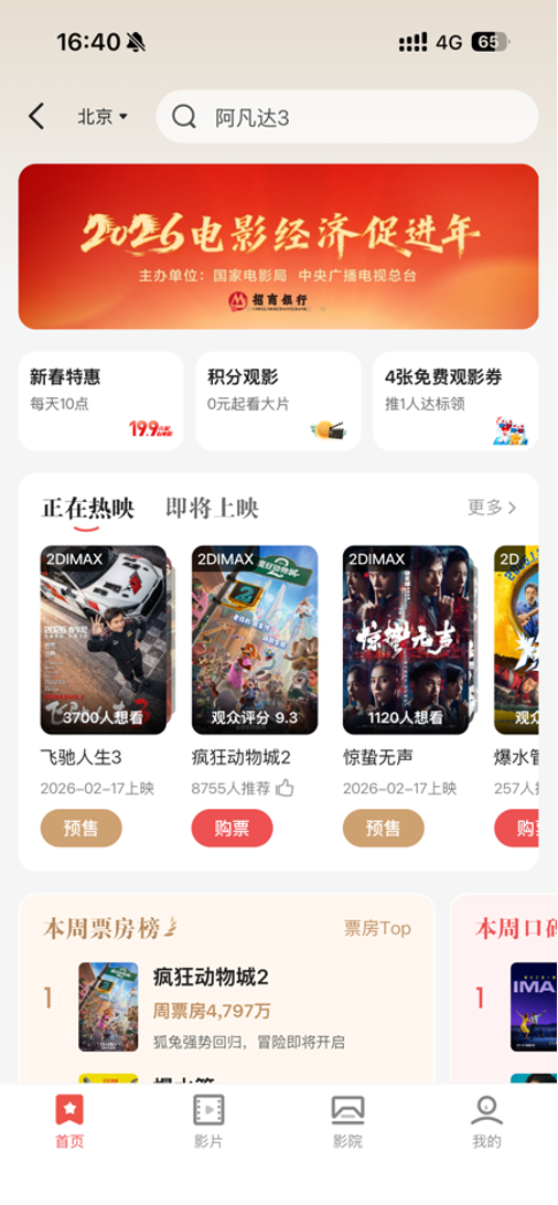 2026年2月13日至23日,招商银行个人信用卡持卡用户在掌上生活App搜“影票”购买电影票,可享“19.9元起观影”活动,每天上午10点开抢。数量有限,先到先得。