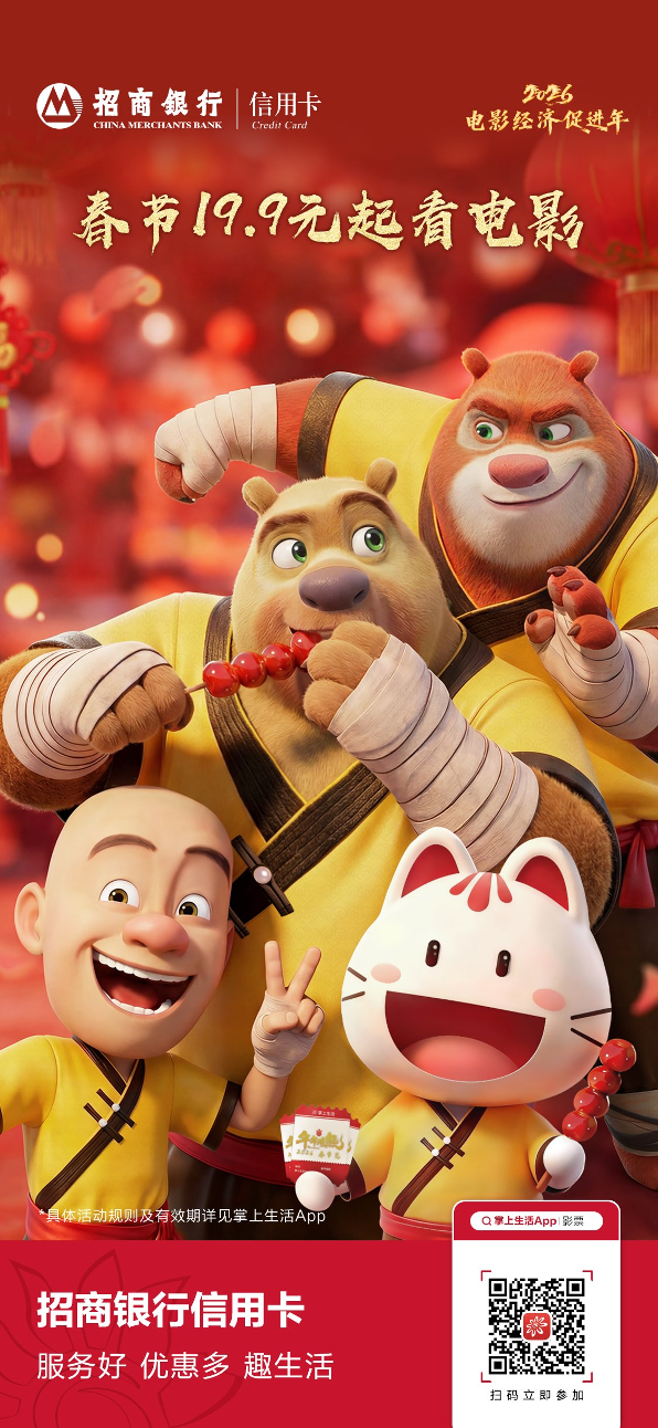 即日起至春节期间,招商银行将联合春节档热门影片《熊出没·年年有熊》与《飞驰人生3》开启全国商圈IP路演活动,还将整合商圈内餐饮、零售、影院等多业态开展促消费相关活动,助力提振新春线下消费需求。预计活动将落地北京、天津、成都、西安等多地。