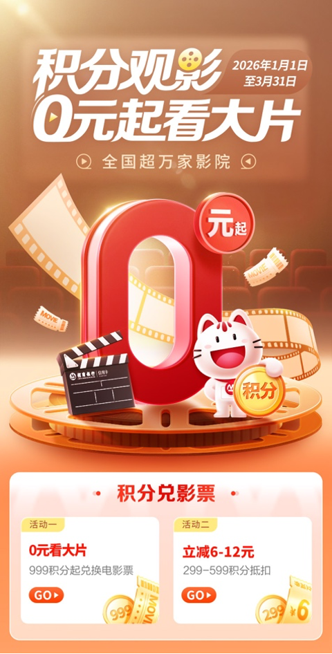 即日起至2026年3月31日,招商银行个人信用卡持卡用户在掌上生活App搜“影票”购买电影票,可参与“999积分起兑电影票”和“299-599积分兑换6-12元立减优惠”活动。