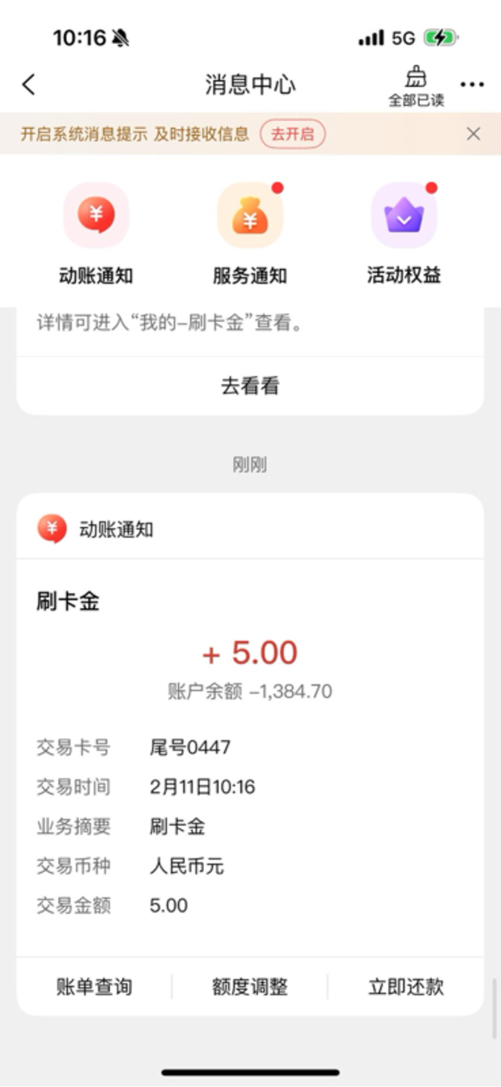在工银e支付收银台完成符合刷卡金核销门槛的消费。完成满足条件的消费后,刷卡金将立即汇入客户的消费账户中,可以通过工银e生活App消息中心查看入账信息。
