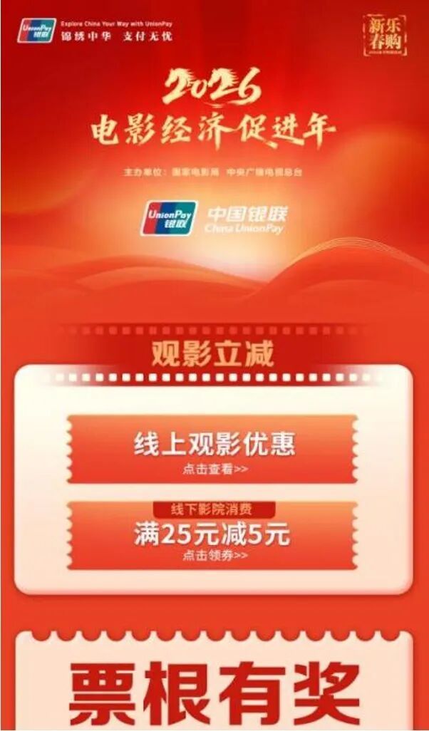 用户可以通过云闪付App“2026电影经济促进年”专题页面进行领取观影福利以及参加票根抽奖活动。(可在云闪付App首页宣传栏进入,或搜索“电影经济促进年”后,进入专题页面)