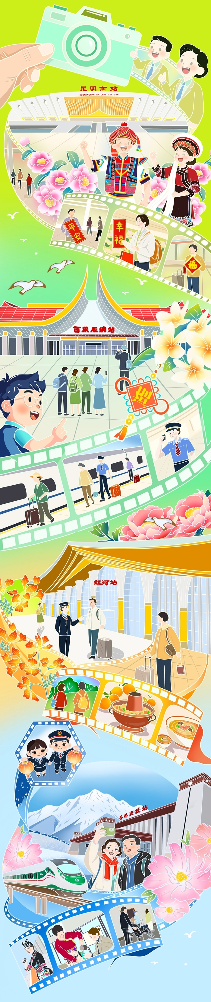 四季流转皆是景,一路欢歌赴团圆。云南铁路以地理之美、人文之韵、服务之暖,让春运不仅是归家之路,更是遇见云南的美好之旅。(文字/向攀 漫画/栗也茹 编辑/杨宇鑫)