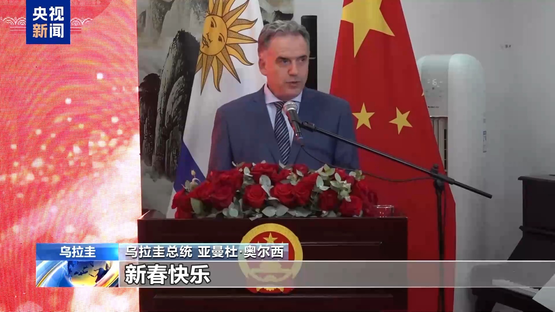 乌拉圭总统 亚曼杜·奥尔西:祝愿全体中国人民、全体乌拉圭人民新春快乐。非常感谢大家,祝大家新春快乐,春节快乐。