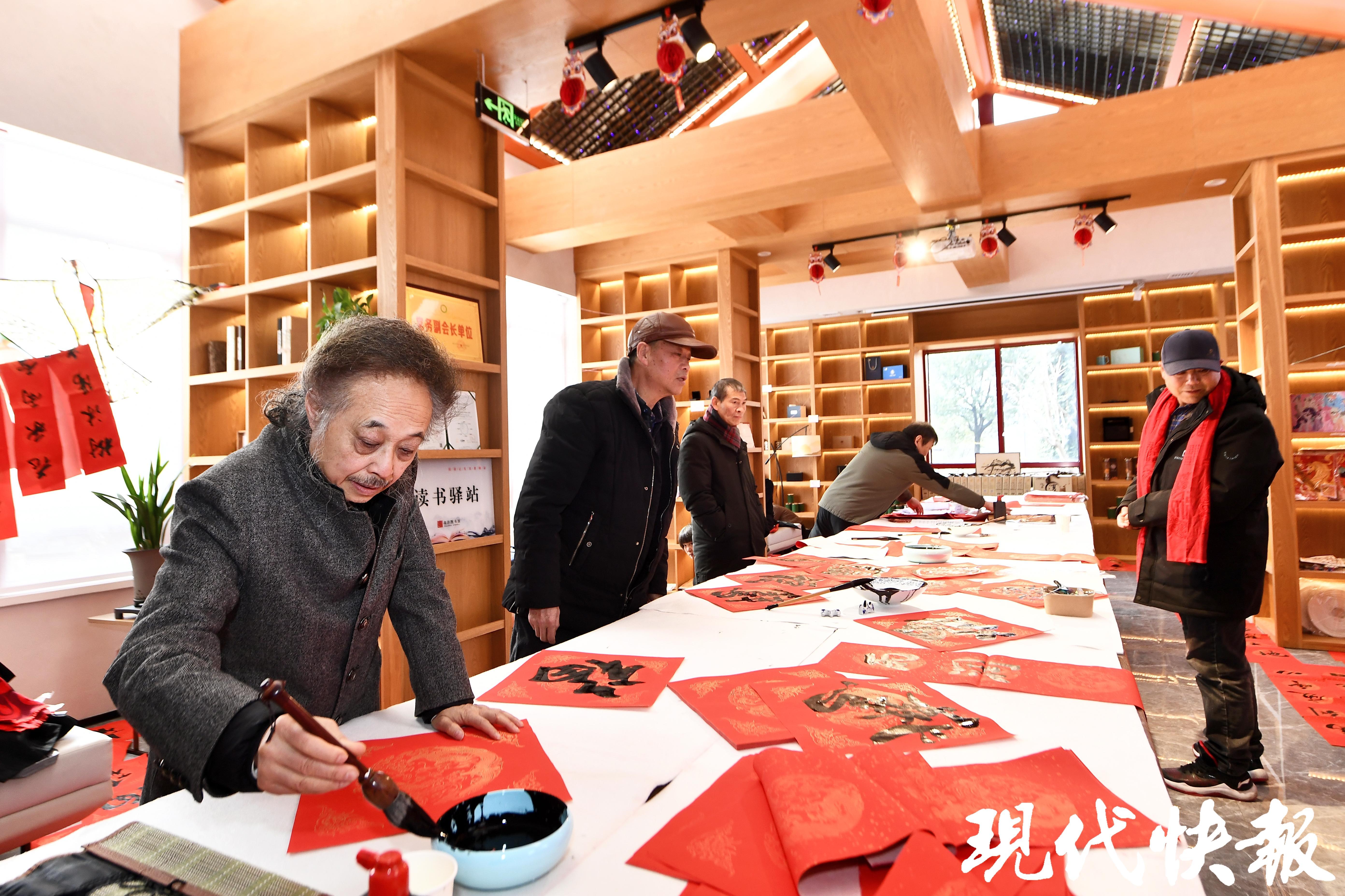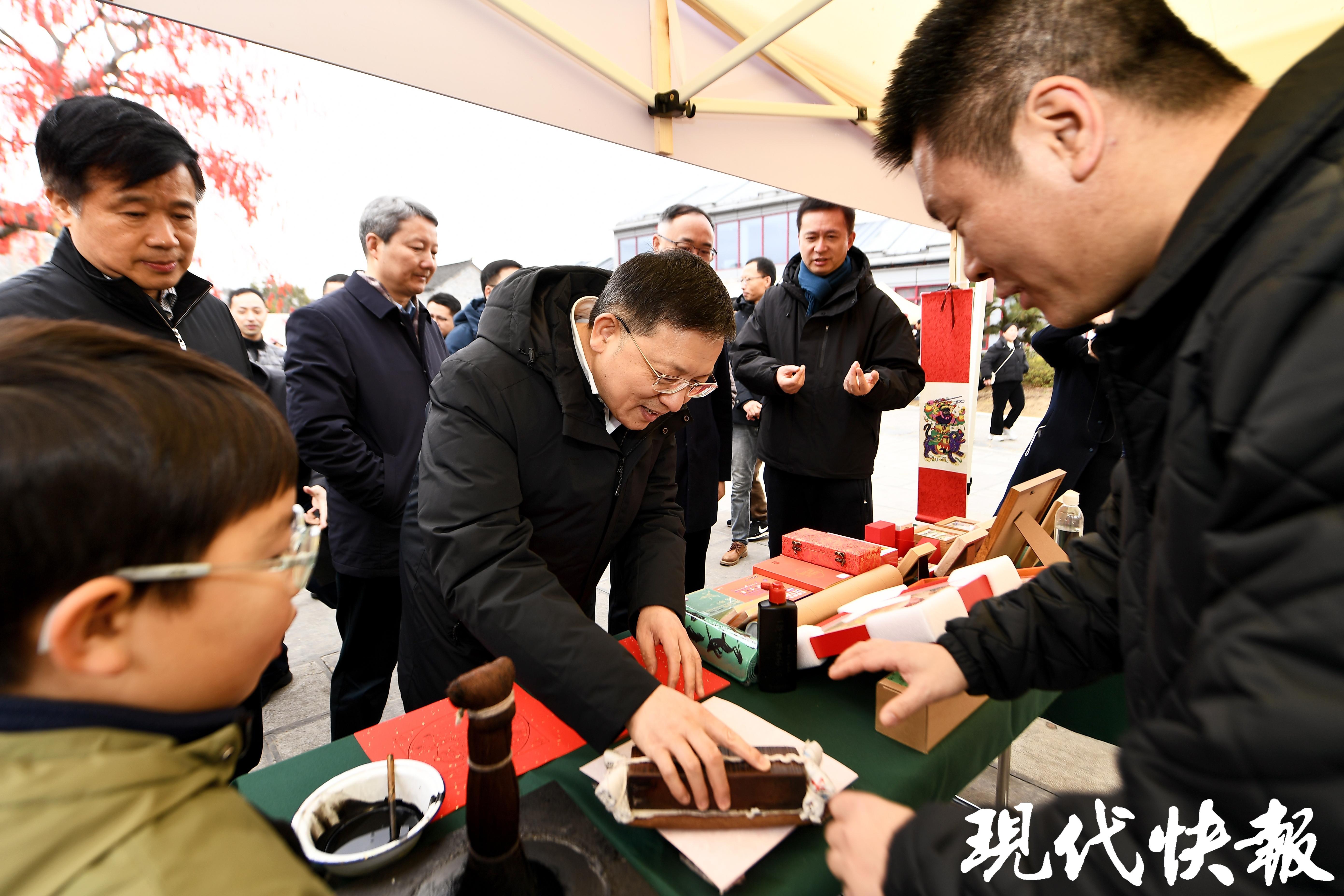 村宴,不仅是味觉的盛宴,更是一场民俗的雅集。2月1日的慢城村宴,是江苏省文学艺术界联合会主办的“迎春花开 马上来福”民艺过大年活动的一部分,集结了苏州桃花坞年画、南京剪纸、扬州漆器、常州梳篦、宜兴紫砂等全省各地民俗非遗,奉上一场全省联动的民间文艺盛宴。摄影、书画艺术家们为50户村民拍摄全家福,还为村民与游客送上装满春联、福字、年灯的新春大礼包。