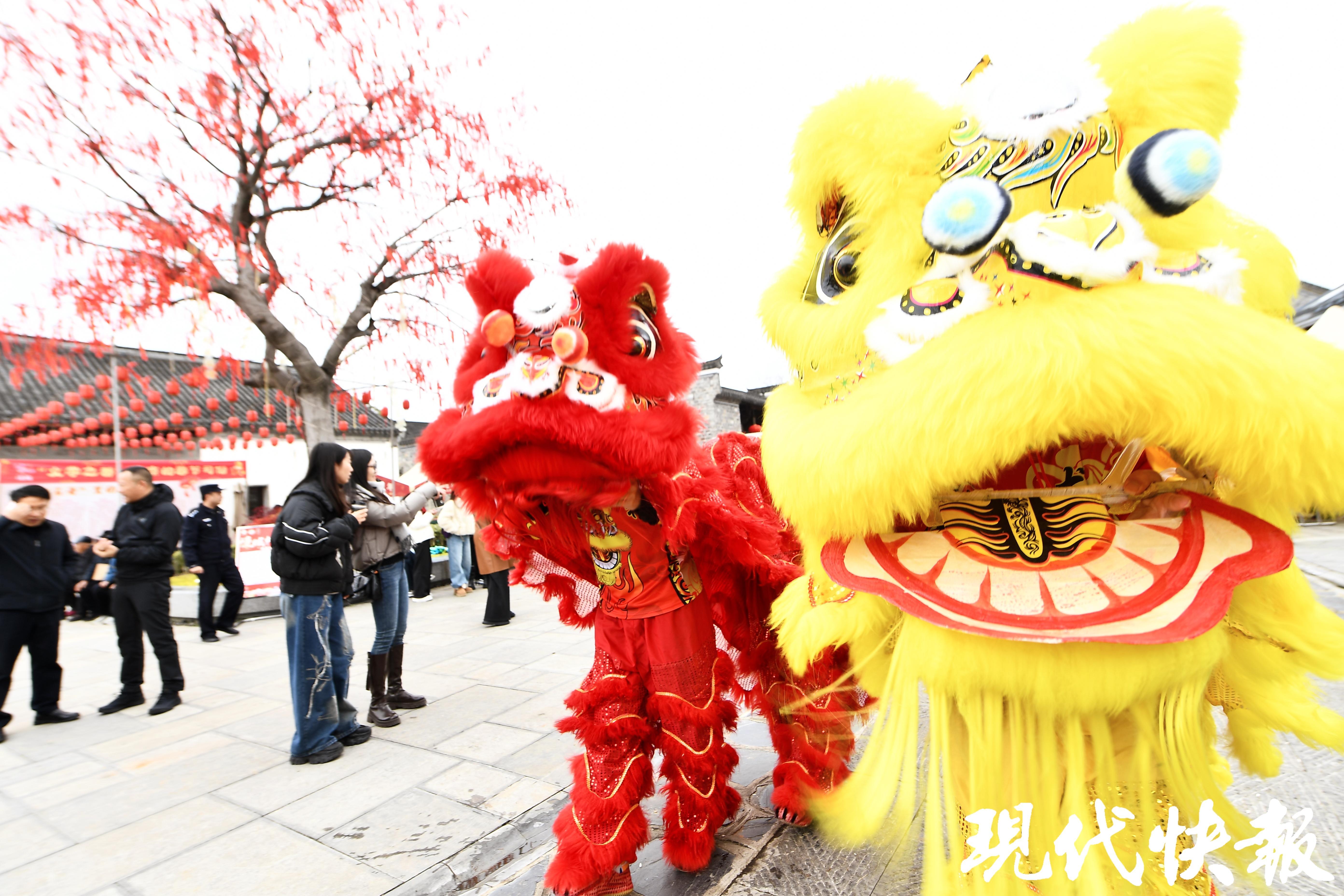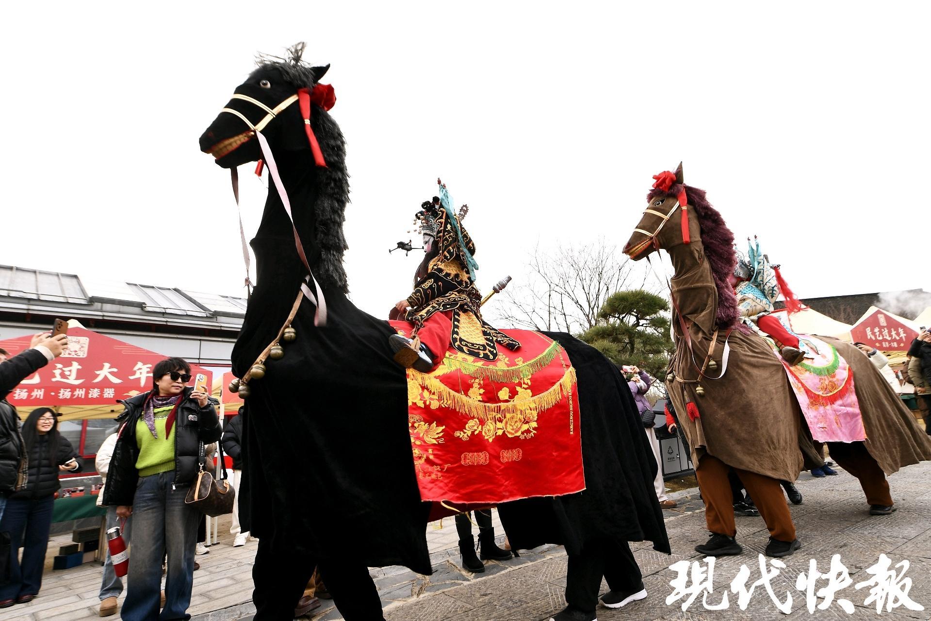 席间,不仅有三锅慢炖的温暖、扶老携幼的团圆,更有民俗表演的热闹。国家级非物质文化遗产东坝大马灯震撼登场,表演队伍穿梭巡游,为这场年终重头戏增添了沉浸式体验。雄健的“战马”踏着铿锵鼓点列队而行,马背上的小演员扮作刘备、关羽、张飞等三国人物,威风凛凛,引来阵阵喝彩。紧随其后的舞龙舞狮也不遑多让,彩龙翻腾似浪,雄狮矫捷如风,它们与宾客亲密互动,将欢腾的气氛推向高潮。