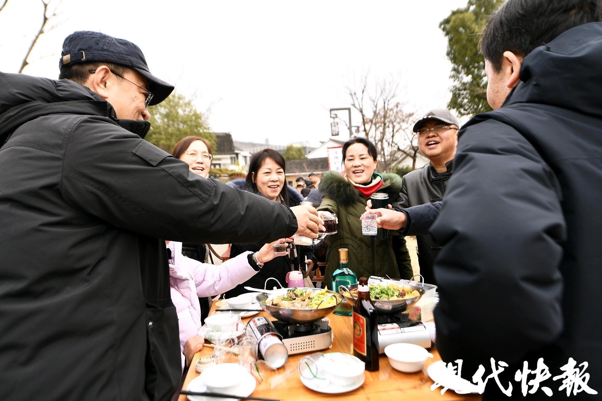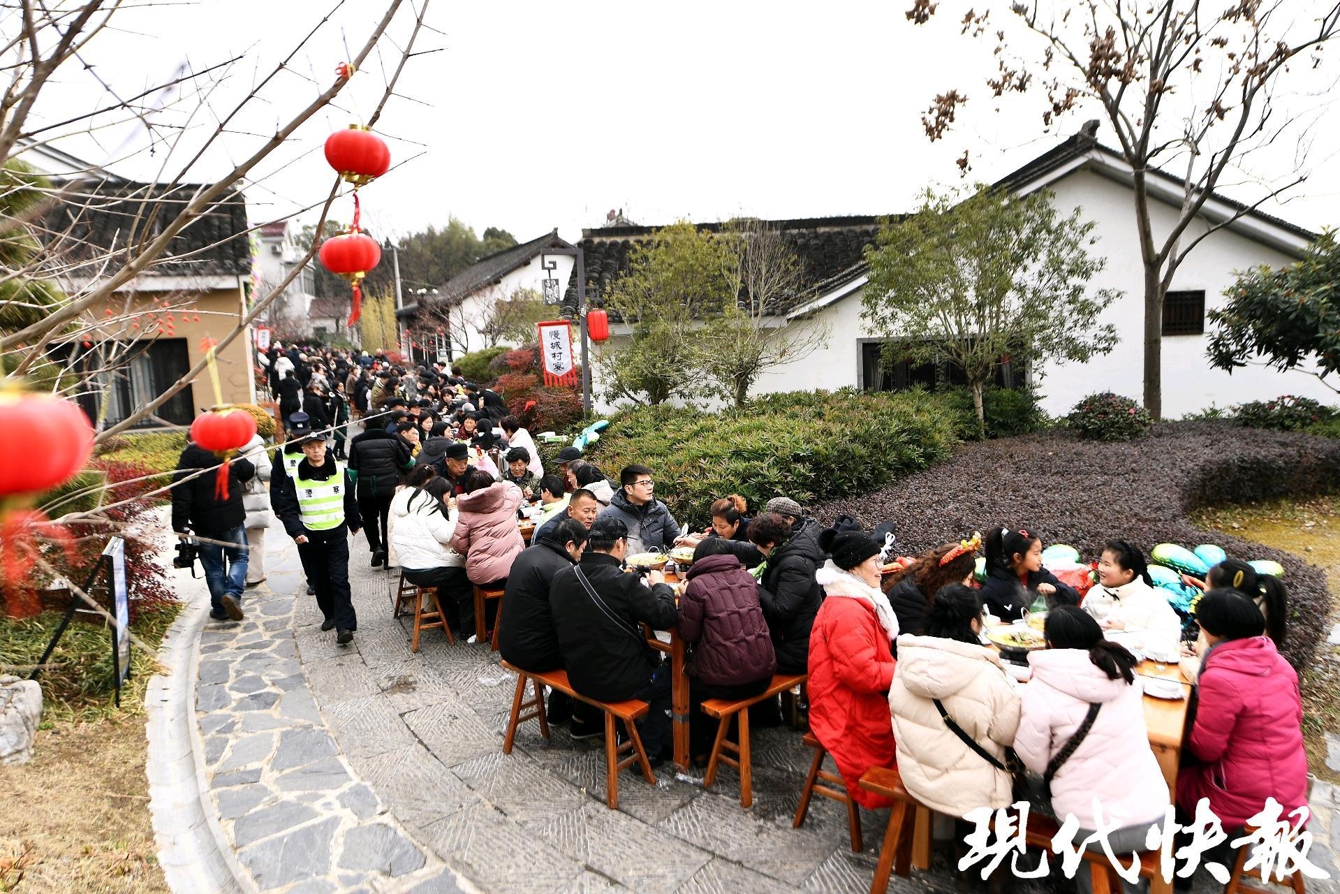 清晨薄雾尚未散尽,南京市高淳区桠溪镇大山村的村民们已开始忙碌,待到日头渐高,一幅热气蒸腾的画卷徐徐展开——100多张八仙桌整齐列阵,如一条静卧的长龙,沿着乡村的小路铺展延伸。提前彩排的锣鼓声、熙熙攘攘的谈笑声交织融合。从附近村镇赶来的乡亲、慕名而至的游客,千余人陆续落座,一张张笑脸在冬日暖阳下显得格外明亮。