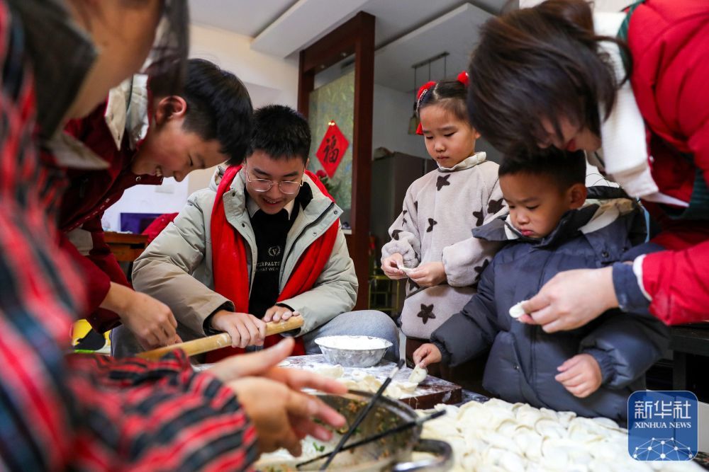 ↑ 2月16日,在江苏省扬州市邗江区荷叶小区一户人家,大人带着孩子包饺子。新华社发(齐立广 摄)