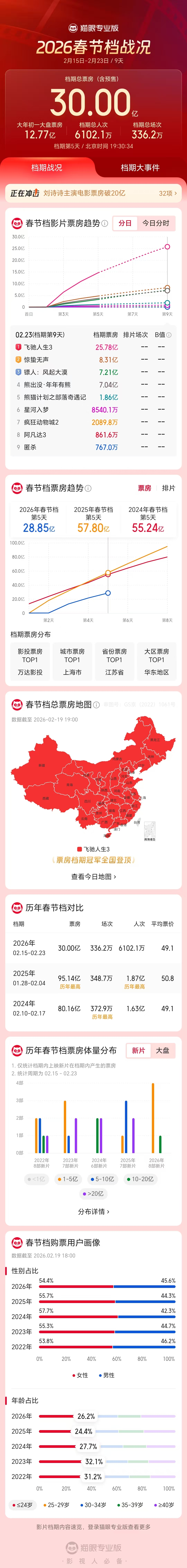 据猫眼专业版数据,2026年春节档档期总票房(含预售)破30亿,《飞驰人生3》《惊蛰无声》《熊出没·年年有熊》分列前三位。