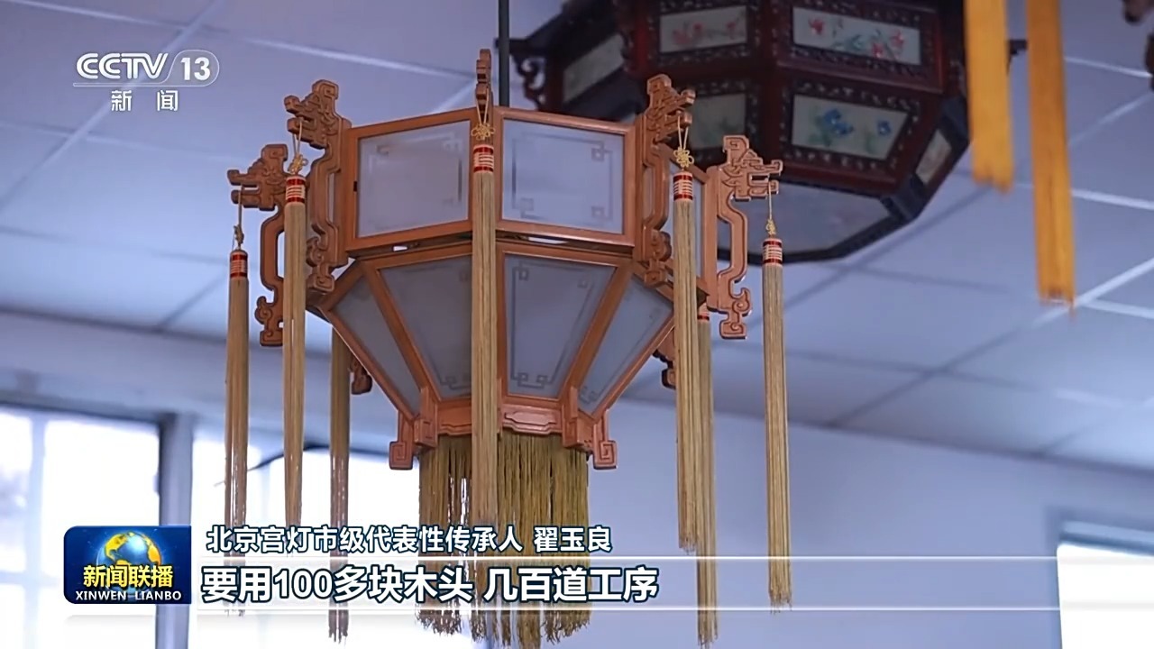 北京宫灯市级代表性传承人 翟玉良:一只宫灯要用100多块木头,几百道工序,包括这个地方,跟古建筑的雀替完全是一样的。