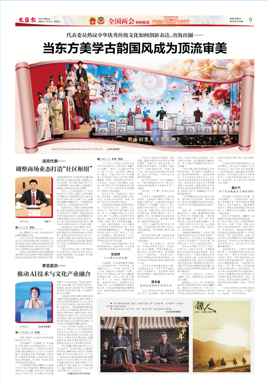 “这是传统文化蓬勃发展最好的时代。”代表委员们认为,互联网、人工智能时代,技术及传播门槛大大降低,每一个人都能成为新大众文艺的主体,每一个人都可以是优质内容的创作者,这给文化尤其是传统文化的“出圈、出海”带来无限想象及可能。