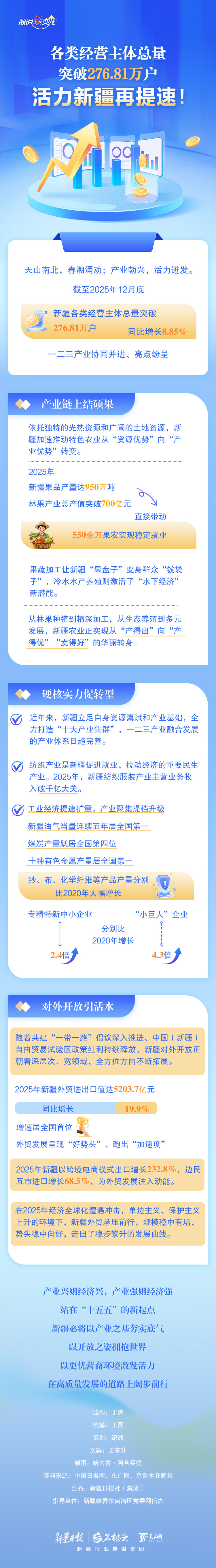 截至2025年12月底,新疆各类经营主体总量突破276.81万户,同比增长8.85%,一二三产业协同并进、亮点纷呈。哪些产业增长迅速?哪些产品产量大幅增长? 今天的《数说“新”变化》一起来看看。