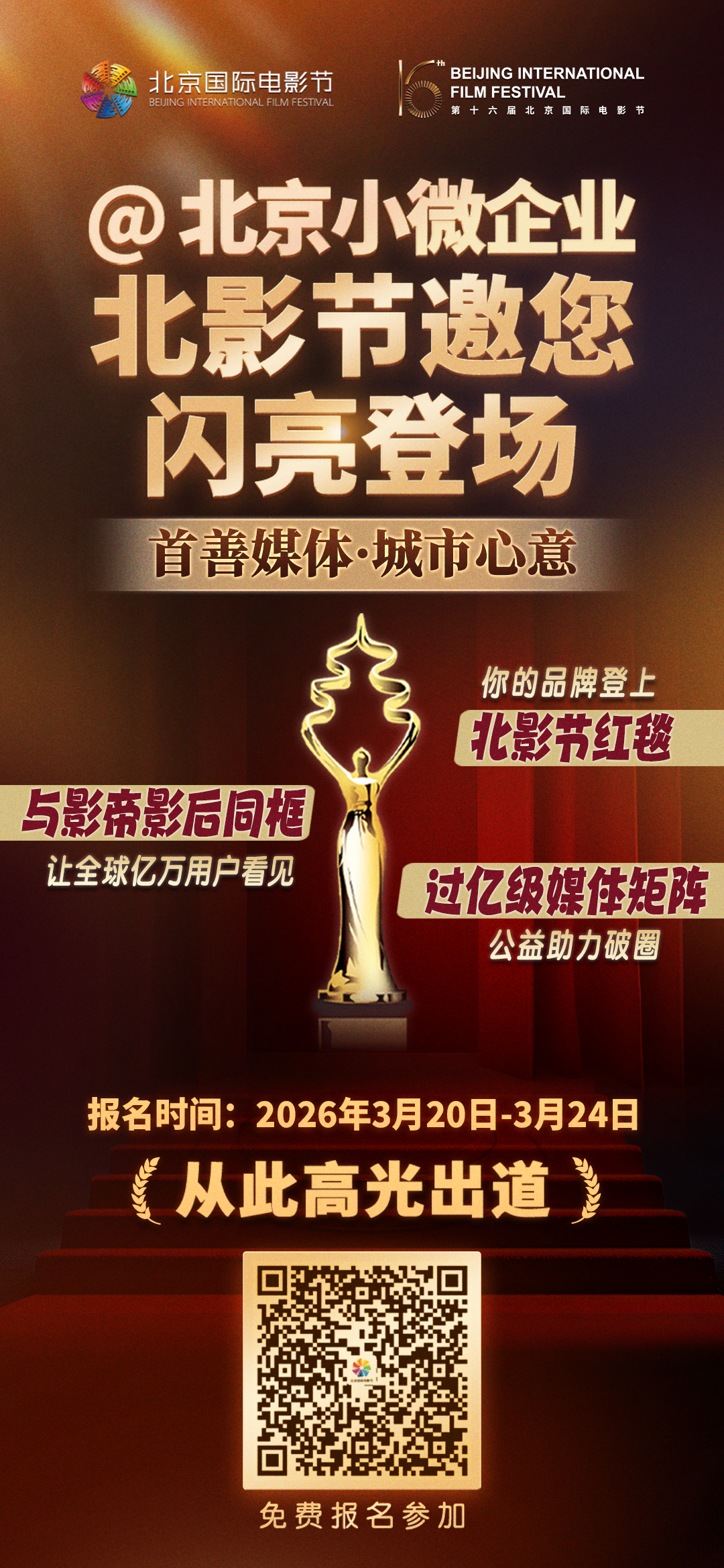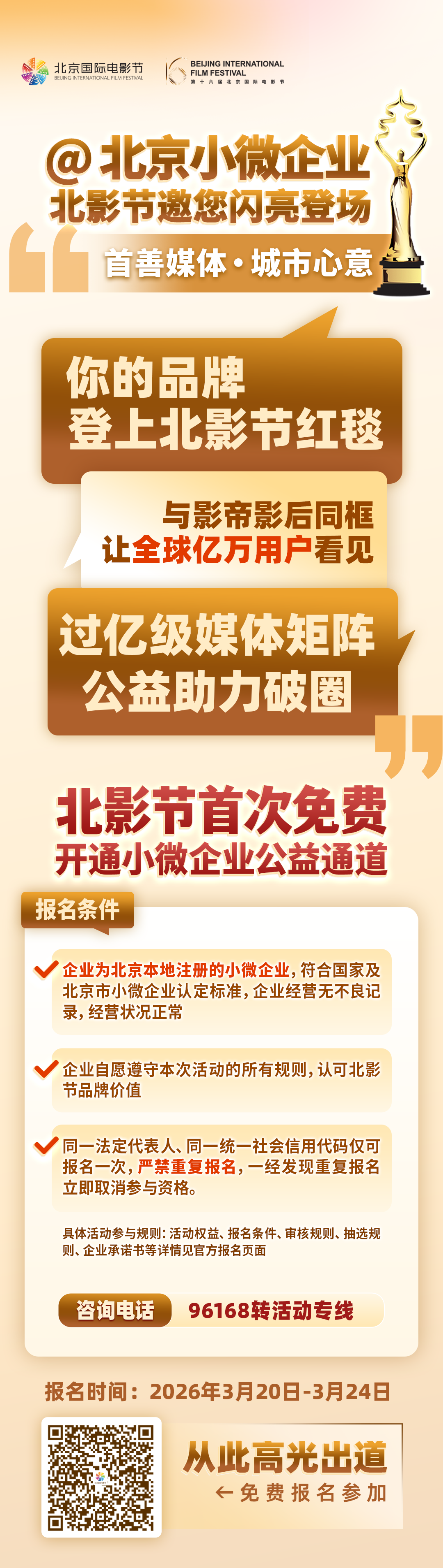 随机抽选16家小微企业,中选即可享红毯星光、专属宣传片大小屏轮播、公益直播、官方身份授权等权益。报名时间:3月20日-3月24日,扫码报名获取详情~ (本次活动为公益性质,主办方不收取任何费用)