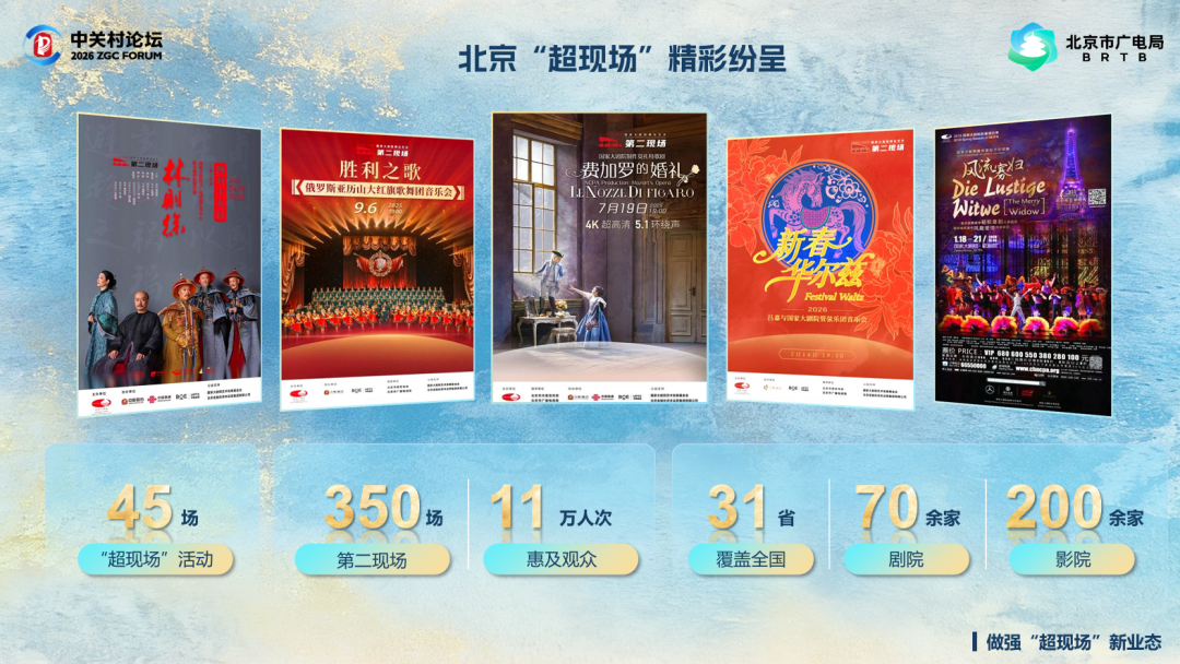 北京市广电局联合相关单位打造的“超现场”作为文化科技融合的创新成果,正以惊人的速度改变着传统演出的传播格局。数据显示,目前“超现场”已覆盖全国31个省(自治区、直辖市)及中国香港、中国澳门,还有马来西亚等地的70余家剧院,200余家影院,第二现场演出超350场次,惠及11万余人次。从世界经典歌剧《费加罗的婚礼》、俄罗斯亚历山大红旗歌舞团“胜利之歌”音乐会,到轻歌剧《风流寡妇》及“新春华尔兹”音乐会,“超现场”正通过数字视听技术助力传统实体演出,生动诠释“一地演出、千里共赏、万人共鸣”的传播效果,让不同地域的观众能够同步沉浸在精彩的演出之中,共享文化盛宴。