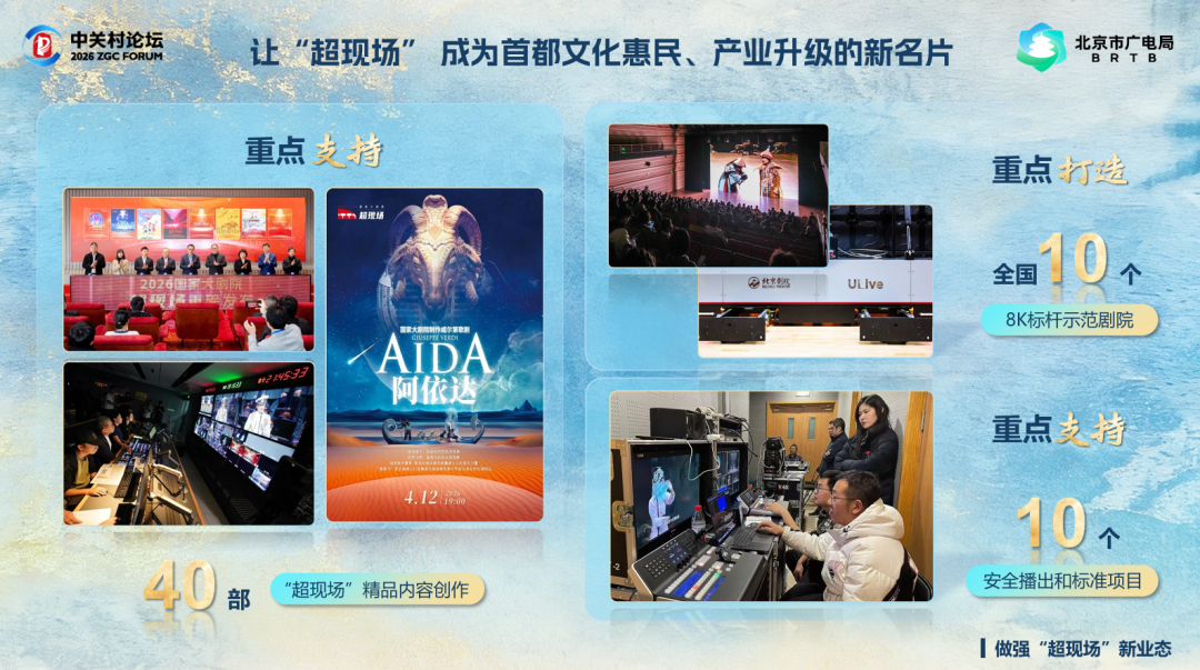 2026年,北京市广电局联合市经济和信息化局制定《北京市关于加快培育“超现场”产业生态的若干措施》,拟支持40部“超现场”精品内容创作和10个安全播出与标准项目,打造全国10个8K标杆示范剧院,布局辐射全国、贯通城乡的100家终端影剧院组网体系。内容、终端、标准齐头并进,开创“超现场”业态和首都文化产业繁荣发展的新局面,让文化惠民深入人心。