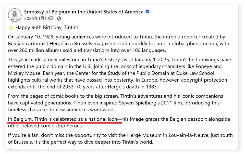 比如,在2025年1月10日比利时驻美国大使馆发布的一则庆祝丁丁诞生96周年的帖文中,比利时方面就明确表示丁丁是比利时的国家标志。