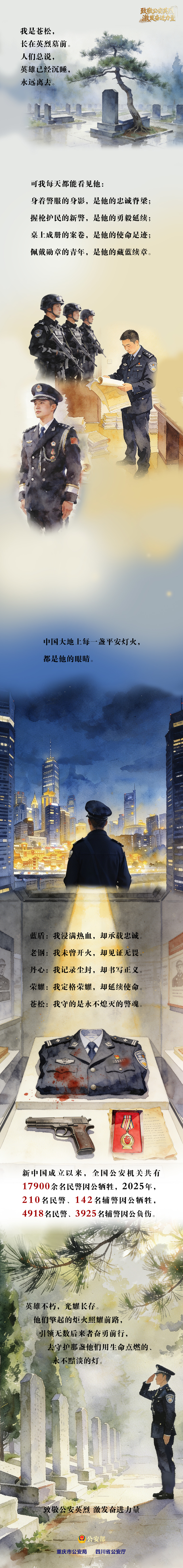 一件警服,一把配枪,一摞卷宗,一枚奖章,我们是公安英烈留在世间的心跳与目光。我们曾陪伴他们冲锋陷阵、守护百姓、追寻正义、践行誓言。如今他们虽已远去,精神却从未消散。无数藏蓝后继者,正接过这份滚烫信仰,让忠诚永续,护岁岁安宁。