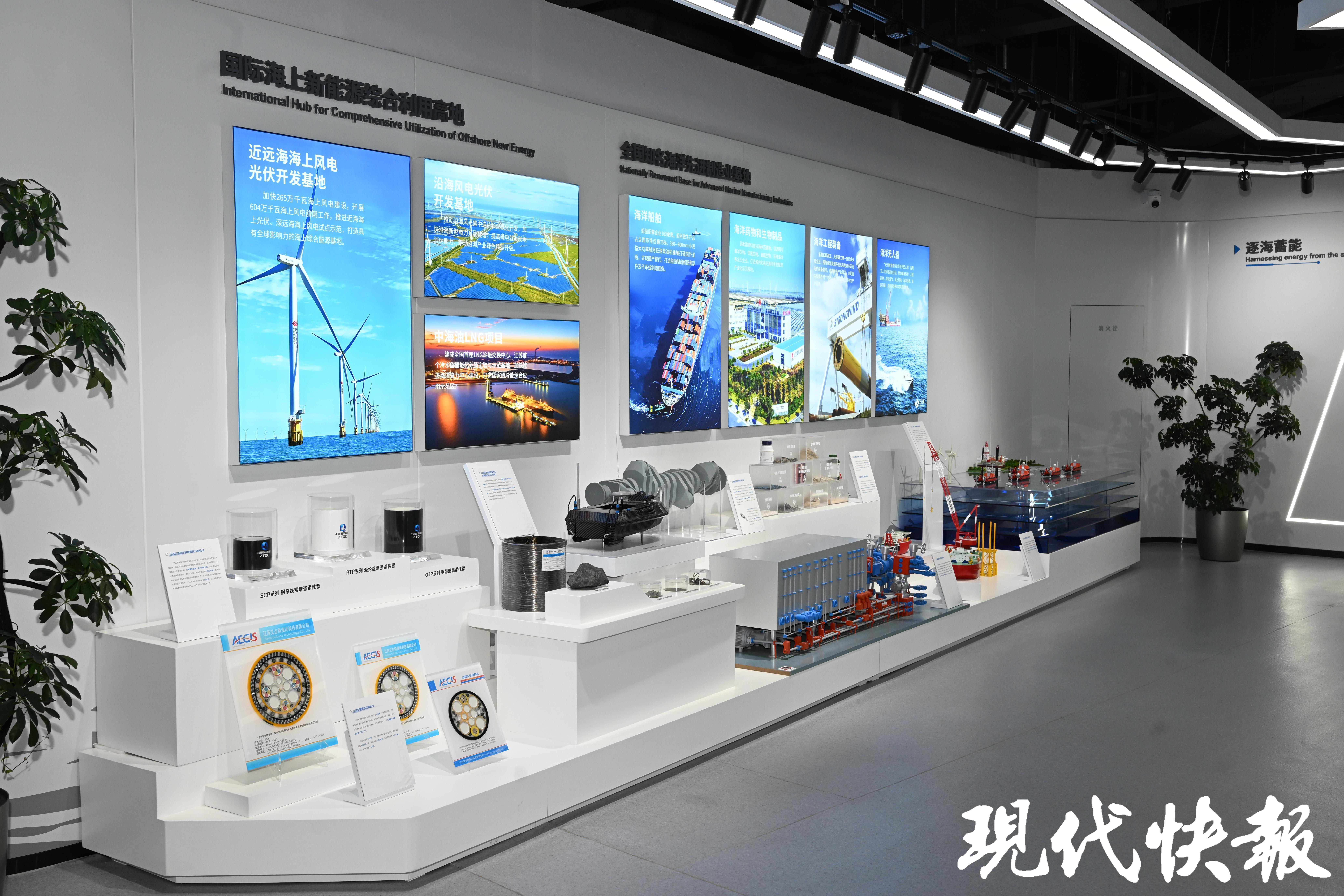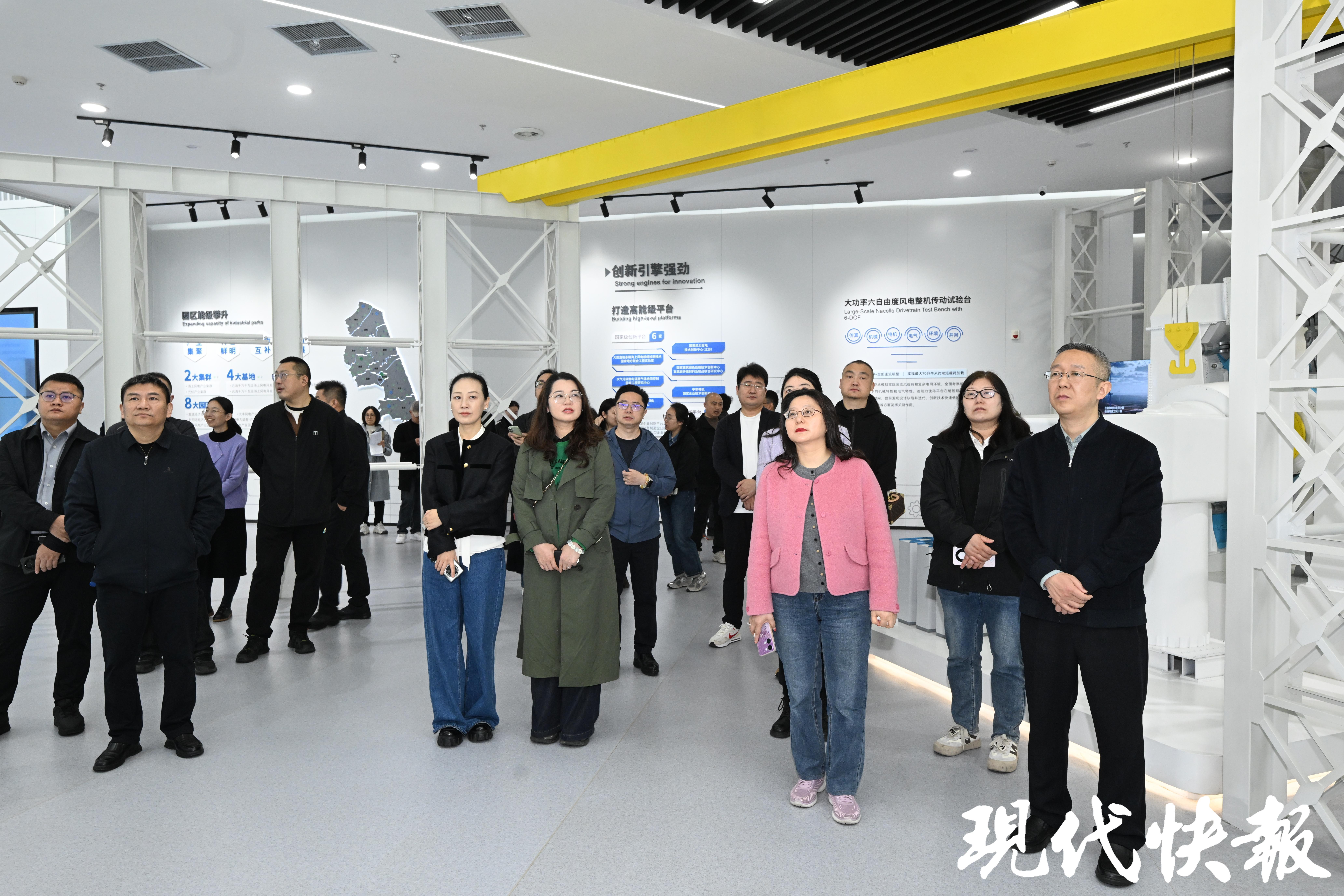 作为此次参观的重点,盐城绿色低碳发展示范区会客厅,总面积约3500平方米,按照“可感知、可体验、可焕新”的设计理念打造。媒体嘉宾依次参观了“逐绿向新、赋能向新、拓海向新、兴农向新、聚势向新”五大板块,全方位感受到盐城在风、光、氢、储、智、海、农七大领域培育新质生产力的禀赋优势、工作成果和发展方向。