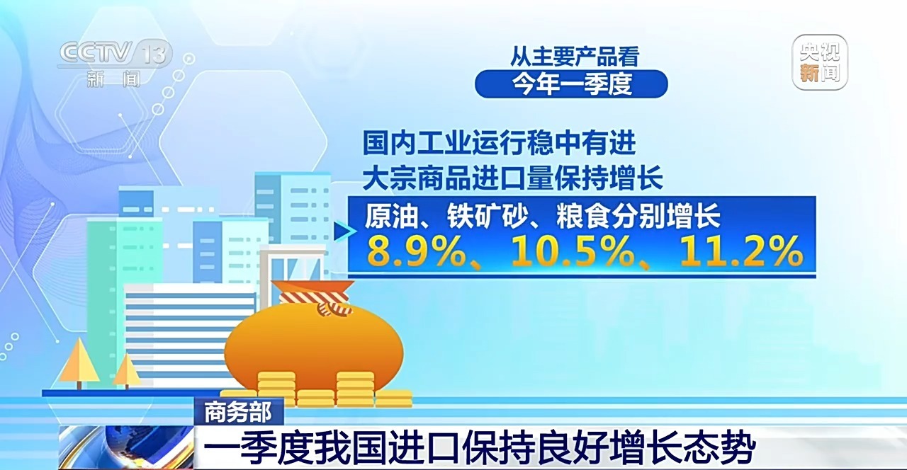 从主要产品看,今年一季度,高新技术产业快速发展,集成电路、电脑零部件进口增长41.4%、45.3%。消费潜能持续激发,消费品进口增长5.4%。国内工业运行稳中有进,大宗商品进口量保持增长,原油、铁矿砂、粮食分别增长8.9%、10.5%、11.2%。