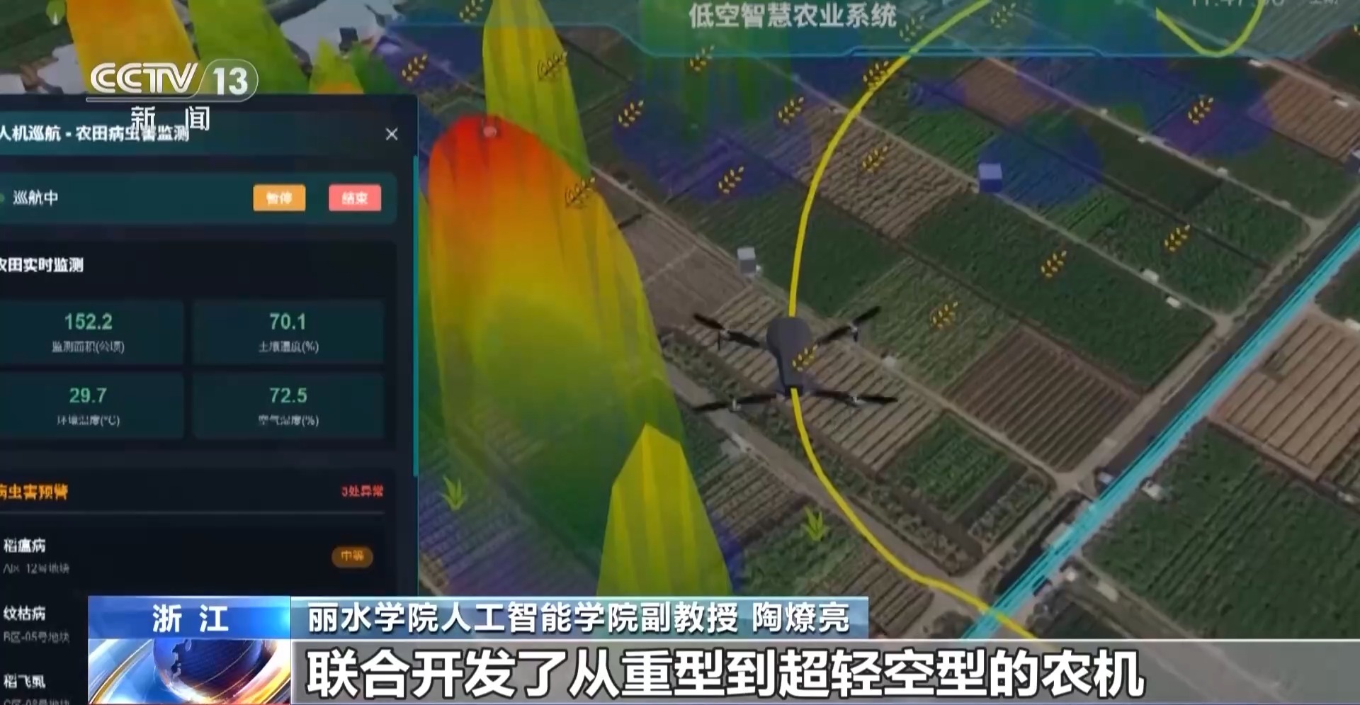 丽水学院人工智能学院副教授 陶燎亮:我们通过改进这个算法,发挥我们学校的算力优势,结合北斗导航等手段,智慧大脑可以精准识别到异形田块,田地边边角角都不会漏。根据不同类型的田块,联合开发了从重型到超轻空型的农机,覆盖了犁地、播种、施肥等工序。