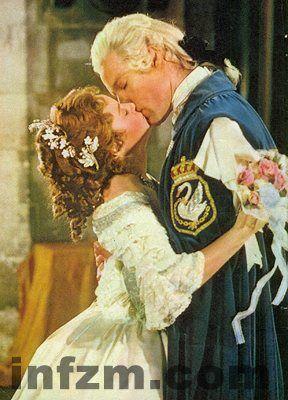《水晶鞋与玫瑰花》中“王子”与“灰姑娘”相拥接吻的剧照