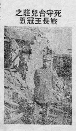 那是一张经过岁月的汁液浸泡几十年的旧报纸。"死守台儿庄之旅长王冠五"几个黑体字和一张王冠五的战地戎装照片赫然入目。它又旧又黄,好像经过烟熏后留下了沉重的历史痕迹,默默地告诉人们那段血与火的历史。