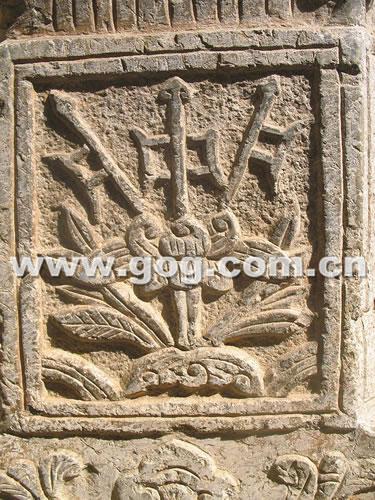 在杨柳村杨柳坝村民组黄志会家,记者在石坎子左右两边,看见摆放的2个雕刻精美的方形赏凳石。每个赏凳石只有正面、左右两面3幅图案,除5幅是一些动物与植物图案外,另一幅是植物与3把古代兵器月牙形的戟相融在一起的图案。