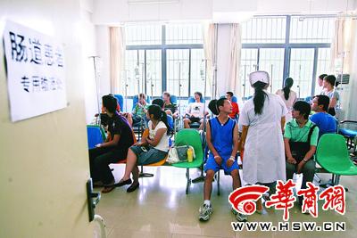 昨日上午9时,接到反映后,未央区疾控中心、卫生监督所立即派人到该校进行调查和执法检查。在该校区门诊,肠道患者专用输液处坐着20多位输液的学生,全都是腹泻患者,以男生居多。