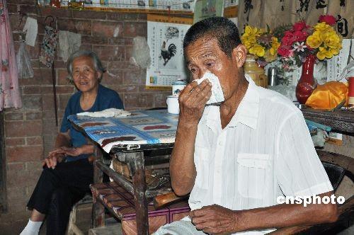 国学大师季羡林先生逝世的消息传到家乡山东临清后,家乡父老乡亲悲痛万分。七十三岁的季义德是季羡林先生的堂孙,七月十一日中午,他和老伴刚准备吃饭,在临清工作的儿子打来电话告之老爷爷不在了,老两口顿时抱头痛哭。图为季羡林的堂孙季义德夫妇对季老逝世难掩悲痛之情。中新社发 孙维华 摄