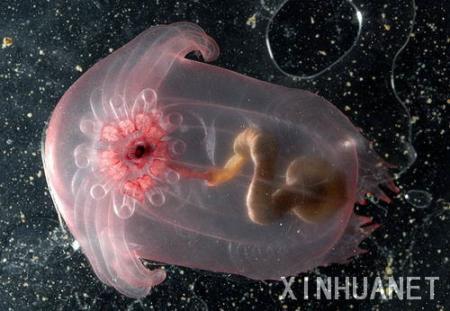 科学家在西里伯斯深海约2500米海域捕获这种粉红色、透明的好似海参的生物。它一般在海底觅食,借助其身体前端类似衣领的结构在水中游动。图中的这只刚进过食,通过其透明的身体,可以看到它膨胀的消化道。