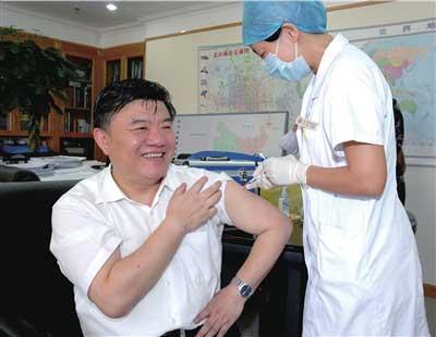 卫生部长陈竺11日在办公室试种第二针国产甲流疫苗。卫生部供图