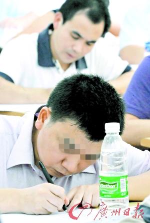 9月6日,在广州市从市直机关选拔优秀干部交流担任街镇行政正职和面向基层干部公开遴选市直机关干部的考试中,有的应考者几乎趴在桌上,眼睛距离试卷很近。 记者黎旭阳摄