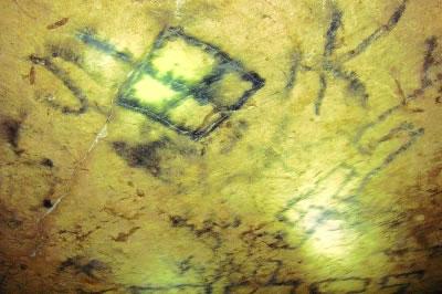 为了一探“神秘符号”,前日,记者来到这个神秘山洞口,村里的张书记给我们每人都准备了厚衣服、探照灯、水、老白干等物品,每人还换了双解放鞋。晚上6:00,我们进洞,这里刮着一阵阵凉风。大家开始不停地在狭窄的乱石中间往下走,大概下到二十多米深时,我们到达了主洞。两个多小时后,我们在面积几百平米的洞顶发现了数百个杂乱的黑色符号,它们有的像地图,有的像宗教符号,其中还有“由”、“天平”、“天上”、“天下”等文字。四周还有“土灶”、“水槽”、“坟堆”等物体。