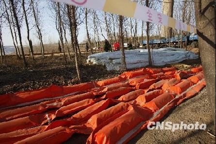 1月4日,河南三门峡黄河公路大桥下黄河水面上连夜设置了一条拦油带。陕西省华县中石油地下输油管道日前发生泄漏,在渭河形成污染带进入黄河,造成黄河污染。 中新社发 张晓理 摄