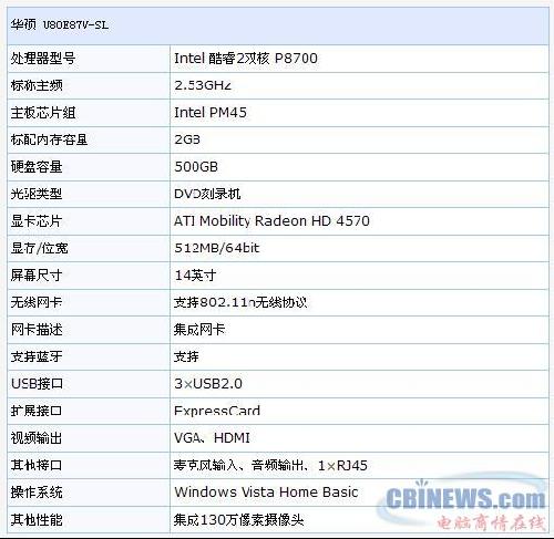 配置上,该机采用了英特尔酷睿2双核P8700处理器、英特尔PM45主板芯片组、蓝牙模块、802.11n无线网卡;标配2GB内存、 500GB硬盘、双层DVD刻录光驱;搭载512MB显存的ATI Mobility Radeon HD 4570独立显卡,提供不错的娱乐支持;该机预装Windows Vista Home Basic操作系统。