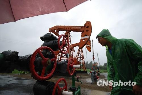 8月10日,台风“莫拉克”袭击江苏扬州,带来了狂风大雨,给江苏油田的采油工作带了巨大困难。图为地处方巷镇黄珏油田的采油职工顶风冒雨检查油井。 中新社发 杜宗军 摄