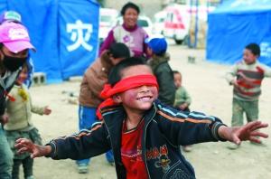 昨日中午,玉树州体育场安置点,一个孩子在接受心理干预,其中包括捉迷藏游戏。18日起,卫生部派出的3名灾后心理援助专家抵达青海,对近200名医务人员和志愿者进行心理援助培训。其后,医务人员和志愿者们将在灾区展开心理干预。 本报记者 吴江 摄