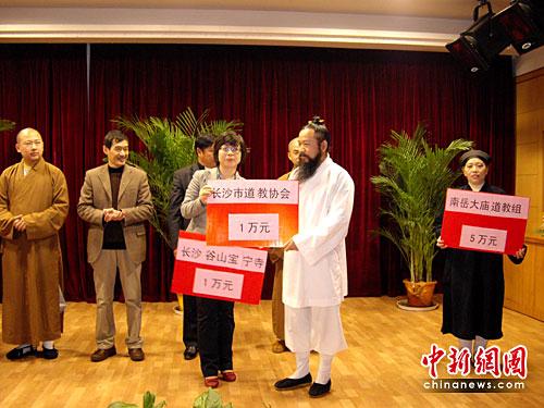 捐款仪式上,湖南省省长助理袁建尧带头捐出2000元,随后湖南省佛教协会、湖南省伊斯兰教协会、湖南省天主教爱国运动委员会和天主教教务委员会、湖南省基督教“三自”爱国运动委员会和基督教协会、长沙市道教协会、长沙麓山寺、南岳大庙道教组和长沙谷山宝宁寺等单位的代表纷纷走上台捐款,表达宗教界人士和信教群众的爱国之情、慈善之心。
