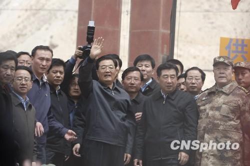 4月18日,中共中央总书记、国家主席、中央军委主席胡锦涛飞抵玉树,看望慰问地震灾区干部群众,实地指导抗震救灾工作。 中新社发 盛佳鹏 摄
